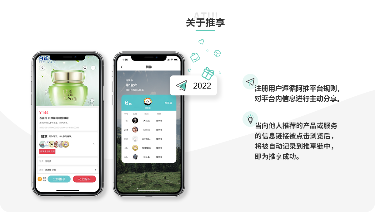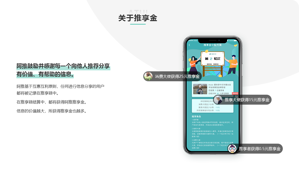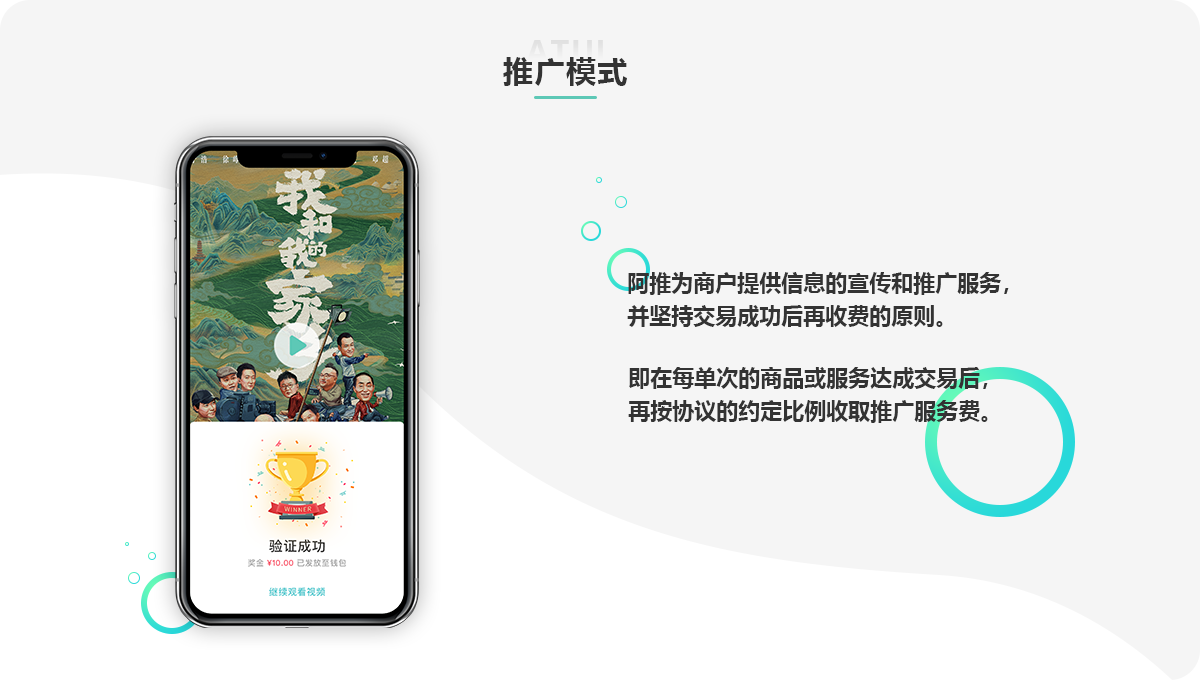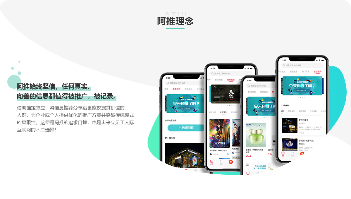 阿推是一个以用户为中心,鼓励用户主动推荐分享优质有价信息的创新型媒介电商平台。 平台由浙江友恒传媒股份有限公司全资打造;友恒传媒自1998年起便致力于电影领域的 广告传媒服务。